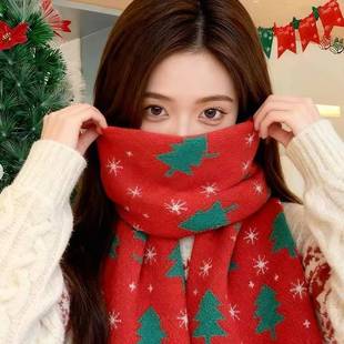 YJ红色圣诞树针织围巾韩系氛围感冬季保暖百搭情侣圣诞礼物围脖 配饰