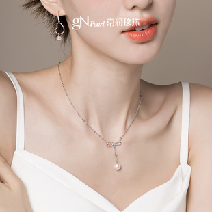京润珍珠 蝴蝶结925银淡水珍珠项链白色简约款吊链珠宝礼物送女友 配饰